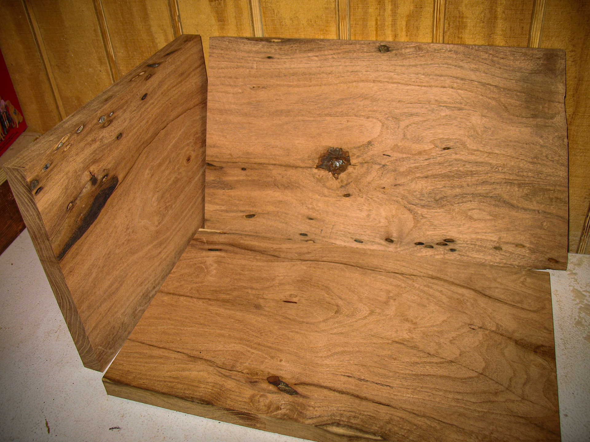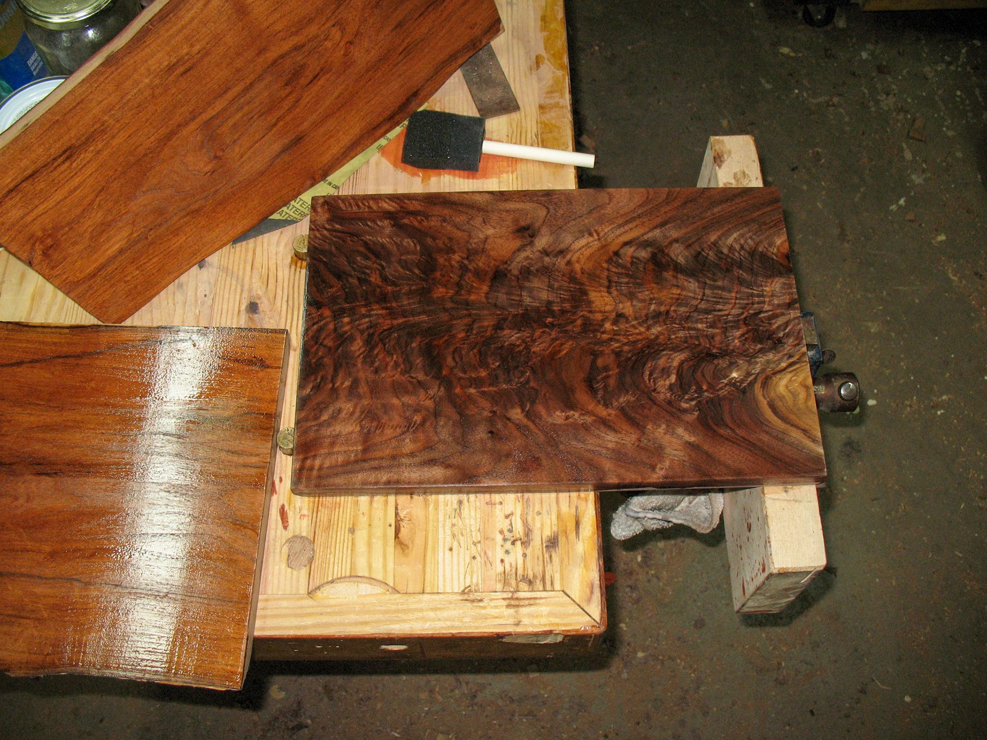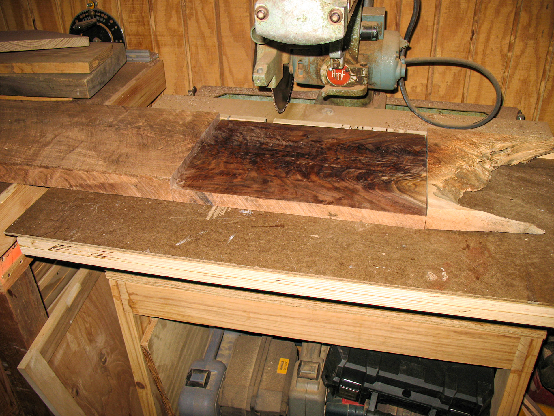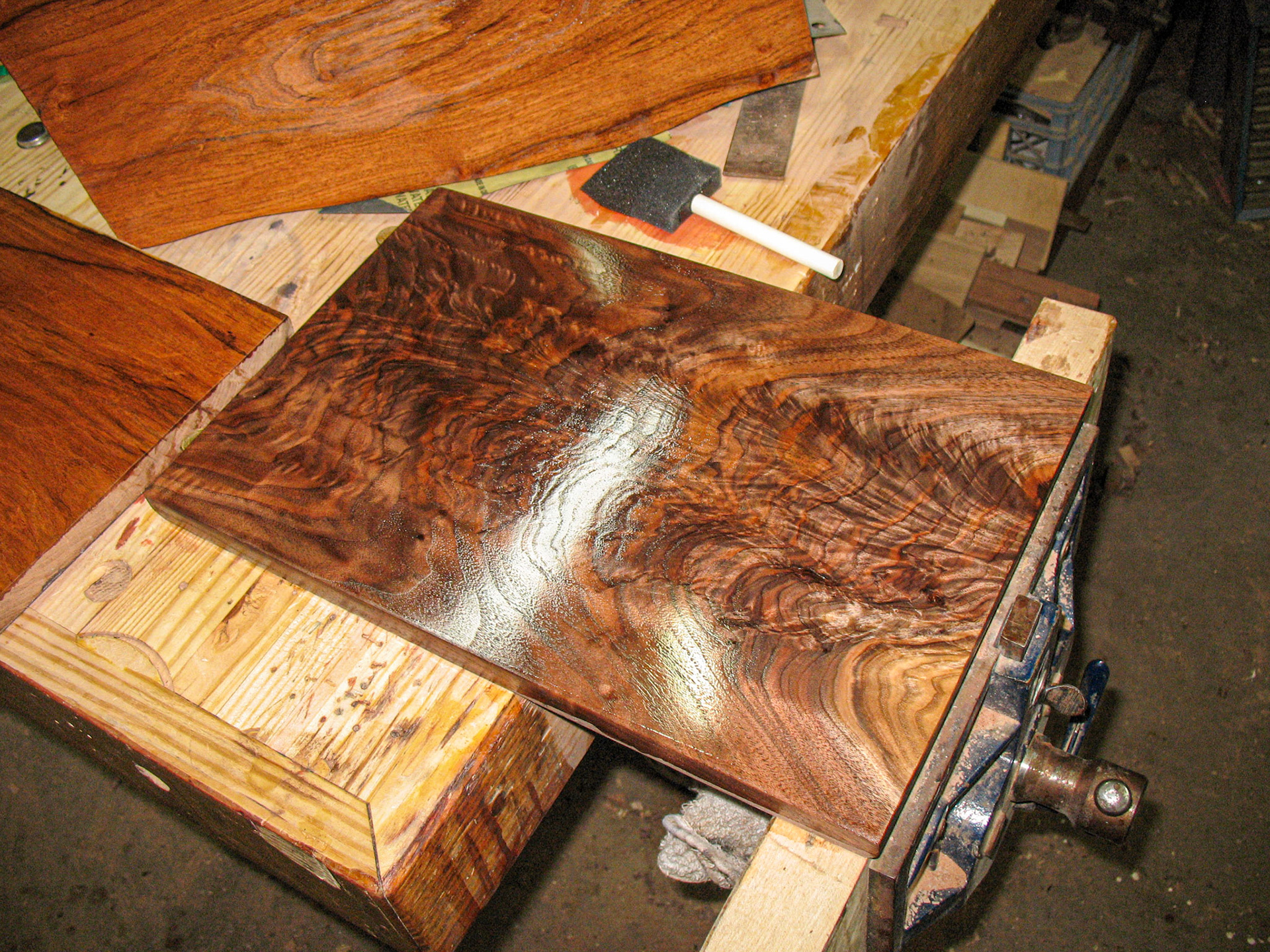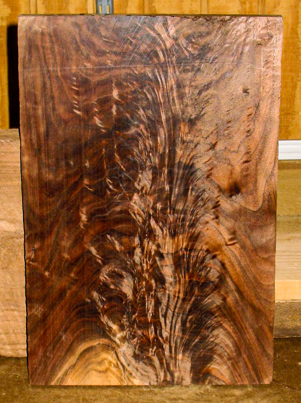 The figured walnut board surrounded by the rough board it was cut from.
