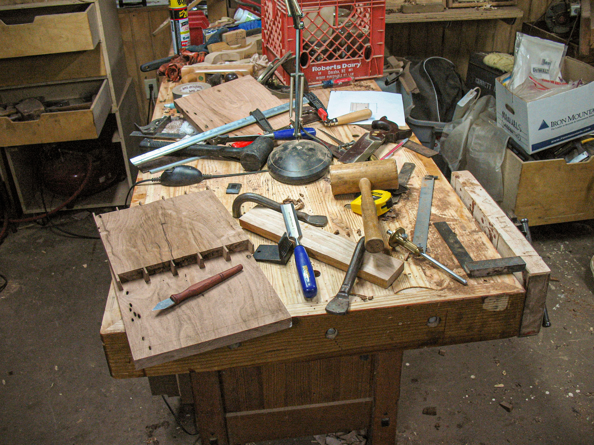 An experiment with finger joints. Notice the broken "fingers" scattered across the table top. I guess I need to space them farther apart.